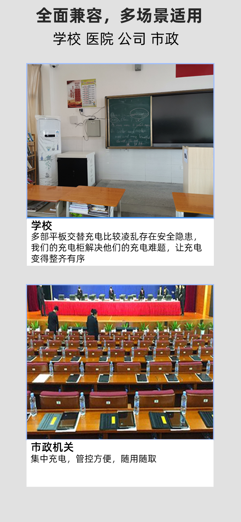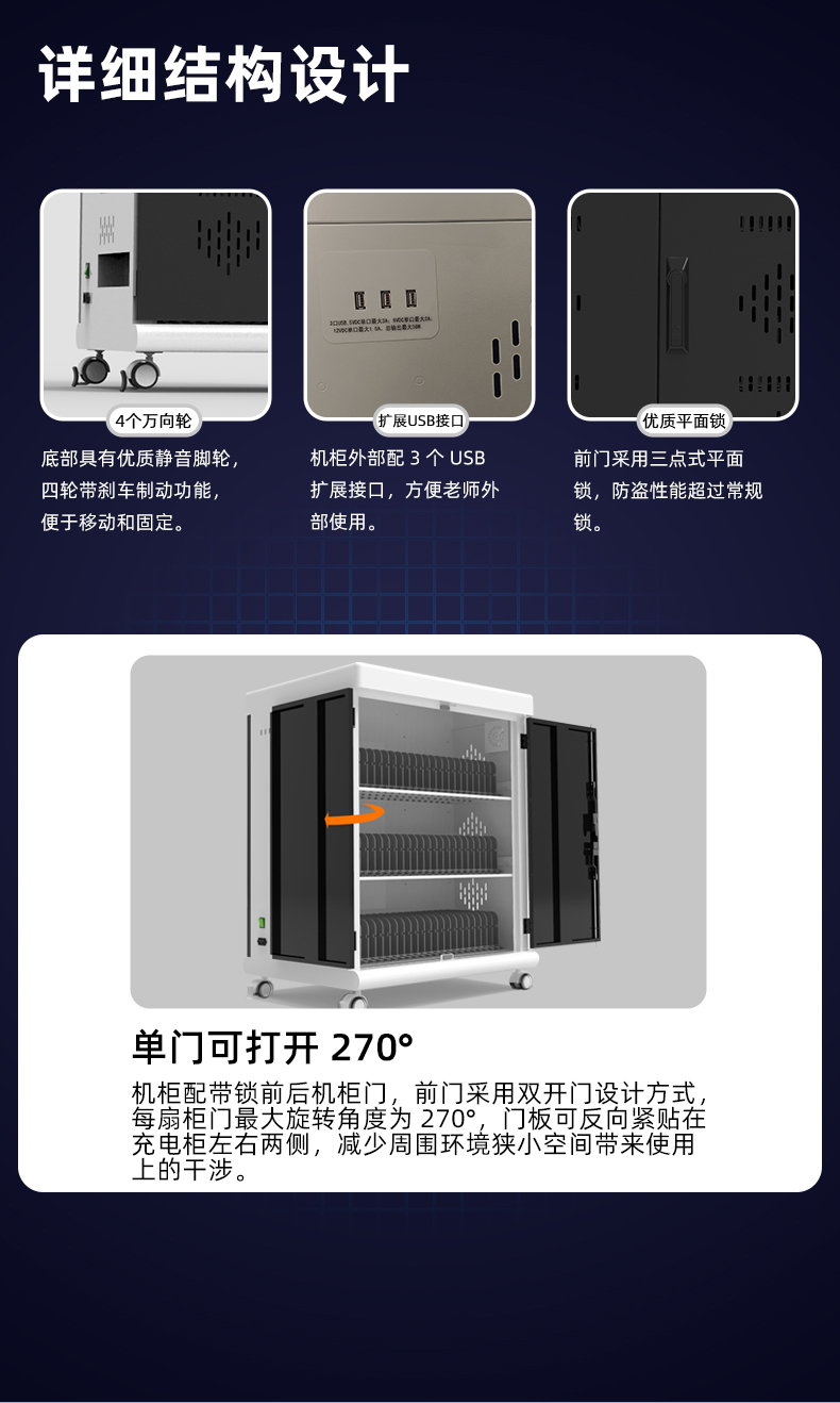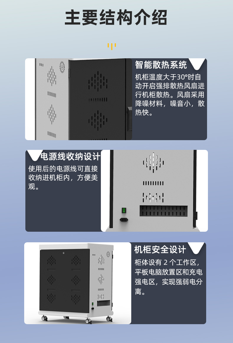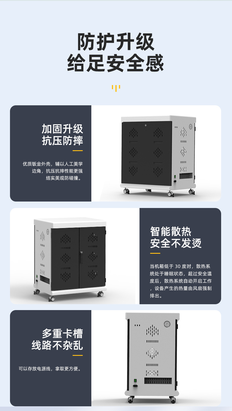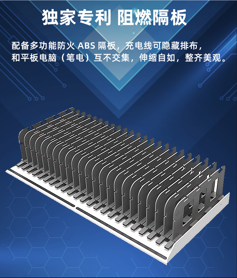 2.擺放整齊:配備多功能塑膠隔板,充電線可隱藏排布,充電線和平板電腦(筆電)互不交集,美觀方便,同時隔板上配有快捷卡位槽,隨用隨取?!铩?br />